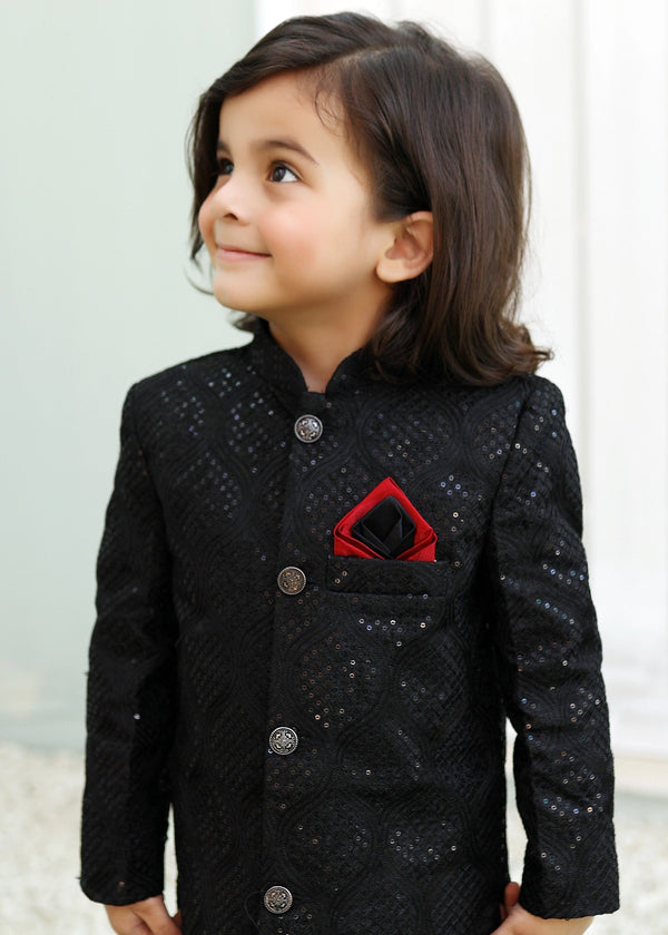 Caviar Black Raw Silk Sherwani – Royal Wedding Wear for Boys