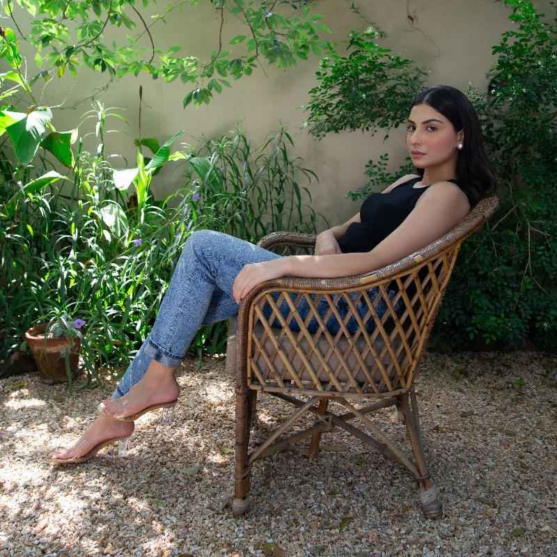 • Crystal-style acrylic heel adds a touch of chic glamour